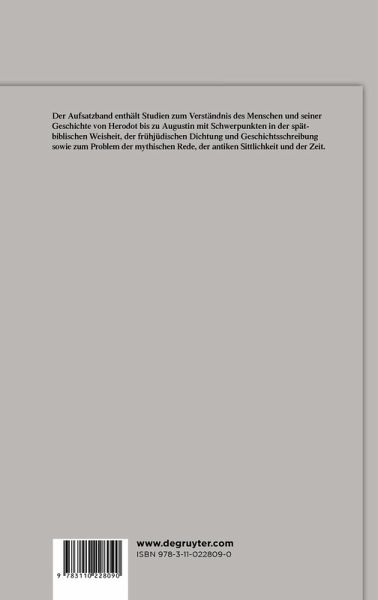 Der Aufsatzband enthält Studien zur Geschichtstheologie Herodots, dem Verständnis des Fremden im Alten Testament, den Büchern Jesus Sirach, der Weisheit Salomons, zur Geschichtstheologie des Flavius Josephus, zum reflektierten Gebrauch des Mythos als Grenzaussage bei Platon, zum Ringen um die Würde des Menschen in Ciceros Tusc.V und zum Verständnis der Zeit von Platon bis Augustin.