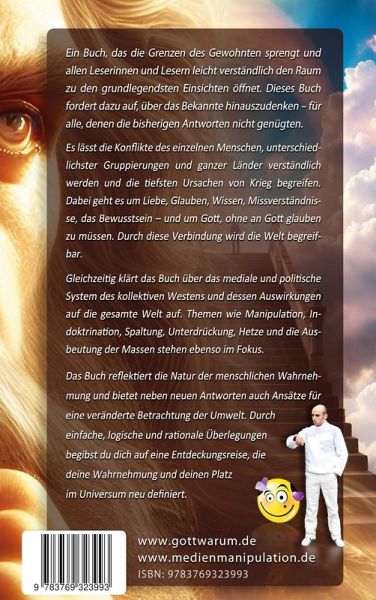 Ein Buch, das die Grenzen des Gewohnten sprengt und allen Leserinnen und Lesern leicht verständlich den Raum zu den grundlegendsten Einsichten öffnet. Dieses Buch fordert dazu auf, über das Bekannte hinauszudenken - für alle, denen die bisherigen Antworten nicht genügten. Es lässt die Konflikte und Missverständnisse des Menschen, unterschiedlichster Gruppierungen und ganzer Länder verständlich werden und so die tiefsten Ursachen von Krieg begreifen. Dabei geht es um Liebe, Wissen, das Bewusstsein, Glauben - und um Gott, ohne an Gott glauben zu müssen. Durch diese Verbindung werden der Mensch und die Welt begreifbar. Gleichzeitig klärt das Buch über das mediale und politische System des kollektiven Westens und dessen Auswirkungen auf die gesamte Welt auf. Themen wie Manipulation, Indoktrination, Spaltung, Unterdrückung, Hetze und die Ausbeutung der Massen stehen durchgehend im Fokus. Das Buch reflektiert die Natur der menschlichen Wahrnehmung und bietet neben neuen Antworten auch Ansätze für eine veränderte Betrachtung der Umwelt. Durch einfache, logische und rationale Überlegungen begibst du dich auf eine Entdeckungsreise, die deine Wahrnehmung und deinen Platz im Universum neu definiert.