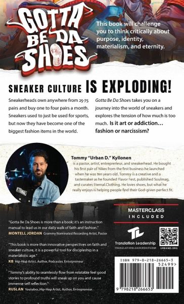 Sneaker Culture Is Exploding! Gotta Be Da Shoes Celebrates Sneakers and Fashion, while it creatively challenges you to think critically about Purpose, Identity, Materialism, and Eternity. Sneakerheads own anywhere from 25-75 pairs and buy one to four pairs a month. Sneakers used to just be for sports but now they have become one of the biggest fashion items in the world. Gotta Be Da Shoes takes you on a journey into the world of sneakers and explores the tension of how much is too much. Is it art or addiction..fashion or narcissism? Gotta Be Da Shoes makes for a great coffee table book as it features a full-color interior with beautiful design and close to a hundred original pictures of sneakers. The book also comes with an Eight Session Masterclass that will help you go deeper.