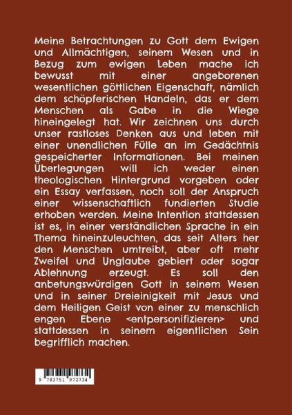 Meine Betrachtungen zu Gott dem Ewigen und Allmächtigen, seinem Wesen und in Bezug zum ewigen Leben mache ich bewusst mit einer angeborenen wesentlichen göttlichen Eigenschaft, nämlich dem schöpferischen Handeln, das er dem Menschen als Gabe in die Wiege hineingelegt hat. Wir zeichnen uns durch unser rastloses Denken aus und leben mit einer unendlichen Fülle an im Gedächtnis gespeicherter Informationen. Bei meinen Überlegungen will ich weder einen theologischen Hintergrund vorgeben oder ein Essay verfassen, noch soll der Anspruch einer wissenschaftlich fundierten Studie erhoben werden. Meine Intention stattdessen ist es, in einer verständlichen Sprache in ein Thema hineinzuleuchten, das seit Alters her den Menschen umtreibt, aber oft mehr Zweifel und Unglaube gebiert oder sogar Ablehnung erzeugt. Es soll den anbetungswürdigen Gott in seinem Wesen und in seiner Dreieinigkeit mit Jesus und dem Heiligen Geist von einer zu menschlich engen Ebene und stattdessen in seinem eigentlichenSein begrifflich machen.