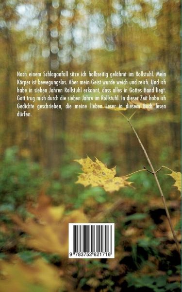Nach einem Schlaganfall sitze ich halbseitig gelähmt im Rollstuhl. Mein Körper ist bewegungslos. Aber mein Geist wurde weich und reich. Und ich habe in sieben Jahren Rollstuhl erkannt, dass alles in Gottes Hand liegt. Gott trug mich durch die sieben Jahre im Rollstuhl. In dieser Zeit habe ich Gedichte geschrieben, die meine lieben Leser in diesem Buch lesen dürfen.