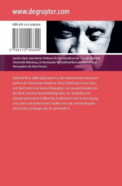 Gottfried Benn (1886-1956) gehört zu den bedeutendsten deutschen Lyrikern der literarischen Moderne. Die Einführung in sein Leben und Werk bietet eine konzise Biographie, eine Gesamtcharakteristik des Werks und eine Auswahlbibliographie. Für Studenten und Literaturinteressierte eröffnet das Studienbuch einen informativen ersten Zugang zum Verständnis des komplexen Werkes und der unüberschaubaren Benn-Forschung. Es ergänzt die ebenfalls im literaturwissenschaftlichen Programm von Walter de Gruyter erscheinende Benn-Bibliographie und das jährlich erscheinende Benn-Forum in idealer Weise.