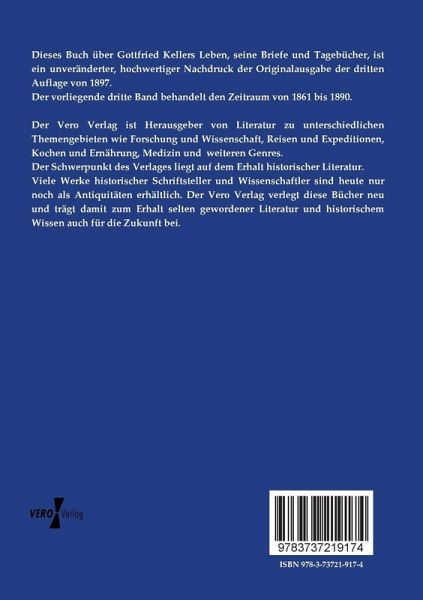Dieses Buch über Gottfried Kellers Leben, seine Briefe und Tagebücher, ist ein unveränderter, hochwertiger Nachdruck der Originalausgabe der dritten Auflage von 1897. Der vorliegende dritte Band behandelt den Zeitraum von 1861 bis 1890.