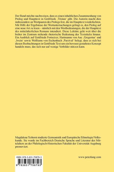 Der Band möchte nachweisen, dass es einen inhaltlichen Zusammenhang von Prolog und Haupttext in Gottfrieds 'Tristan' gibt. Die Autorin macht dies insbesondere an Wortpaaren des Prologs fest, die im Haupttext wiederkehren. Mit Hilfe der Ergebnisse der Wortuntersuchungen gelingt es, den Prolog auf eine neue Art zu lesen - nämlich mit den Wortbedeutungen, die der Haupttext des mittelalterlichen Romans intendiert. Diese Lektüre geht weit über die bisher im Zentrum stehende rhetorische Bedeutung des Textstücks hinaus. Ein Ausblick auf Gottfrieds Fortsetzer, Hartmanns von Aue 'Gregorius' und 'Iwein' sowie Wolframs von Eschenbach 'Parzival' belegt, dass es sich bei diesen Beobachtungen in Gottfrieds Text um ein bewusst gestaltetes Konzept handeln muss, das sich nur auf wenige Vorbilder stützen kann.