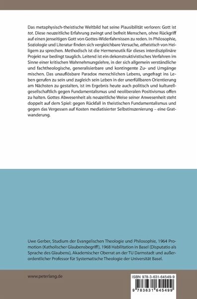 Das metaphysisch-theistische Weltbild hat seine Plausibilität verloren: Gott ist tot. Diese neuzeitliche Erfahrung zwingt und befreit Menschen, ohne Rückgriff auf einen jenseitigen Gott von Gottes-Widerfahrnissen zu reden. In Philosophie, Soziologie und Literatur finden sich vergleichbare Versuche, atheistisch von Heiligem zu sprechen. Methodisch ist die Hermeneutik für dieses interdisziplinäre Projekt nur bedingt tauglich. Leitend ist ein dekonstruktivistisches Verfahren im Sinne einer kritischen Wahrnehmungslehre, in der sich allgemein verständliche und fachtheologische, generalisierbare und kontingente Zu- und Umgänge mischen. Das unauflösbare Paradox menschlichen Lebens, ungefragt ins Leben gerufen zu sein und zugleich sein Leben in der unerfüllbaren Orientierung am Nächsten zu gestalten, ist im Ergebnis heute auch politisch und kulturell-gesellschaftlich gegen Fundamentalismus und neoliberalen Positivismus offen zu halten. Gottes Abwesenheit als neuzeitliche Weise seiner Anwesenheit steht doppelt auf dem Spiel: gegen Rückfall in theistischen Fundamentalismus und gegen das Vergessen auf Kosten mediatisierter Selbstinszenierung - eine Gratwanderung.