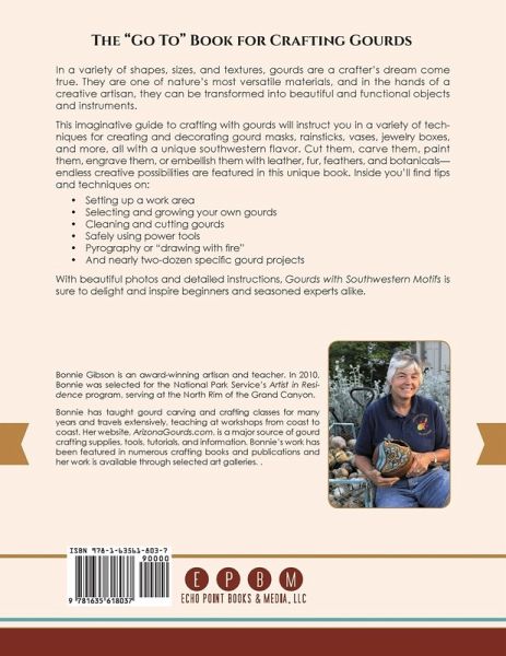 In a variety of shapes, sizes, and textures, gourds are a crafter's dream come true. They are one of nature's most versatile materials, and in the hands of a creative artisan, they can be transformed into beautiful and functional objects and instruments. This imaginative guide to crafting with gourds will instruct you in a variety of techniques for creating and decorating gourd masks, rainsticks, vases, jewelry boxes, and more, all with a unique southwestern flavor. Cut them, carve them, paint them, engrave them, or embellish them with leather, fur, feathers, and botanicals-endless creative possibilities are featured in this unique book. Inside you'll find tips and techniques on: Setting up a work area Selecting and growing your own gourds Cleaning and cutting gourds Safely using power tools Pyrography or "drawing with fire" And nearly two-dozen specific gourd projects With beautiful photos and detailed instructions, Gourds with Southwestern Motifs is sure to delight and inspire beginners and seasoned experts alike.