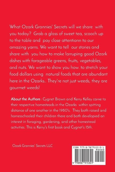 Welcome to our Ozarks! Whether you're a tourist just passing through, a newbie to the area, or someone who has lived in the Ozarks for a long time, we want to share an aspect of the Ozarks that is near and dear to our hearts. In this folksy narrator-style cookbook, we of Ozark Grannies' Secrets want to share some of our knowledge of forageable foods with you. So, what will we at Ozark Grannies' Secrets share with you today in the first book in our series? Grab a glass of sweet tea, scooch up to the table, and pay attention to our unique yarns. We want to entertain you with stories and share how you can make larruping good Ozark dishes with forageable greens, fruits, vegetables, and nuts to stretch your food dollars using some of the natural foods available to us here in the Ozarks. These aren't just weeds, they are gourmet weeds! In this little volume, we are sharing recipes information and delicious recipes about common Ozark plants. Ozark Forageable Greens including Asparagus, Chickweed, Red Clover, White Clover, Common Dandelion (Taraxacum officinale), Orange Daylily greens, Green Brier, Henbit, Dead Nettle, Lady's Thumb and Knotweed and their many varieties, Smartweed, Lamb's Quarters, Live Forever, Wild Mustard, Stinging Nettle, Perilla Mint, Plantain, Poke Sallet, Common Purslane, Redbud, Reindeer Lichen, Sassafras (sassafras albidum), Dock, curly, Spiderwort, Violet, and Watercress Ozark Forageable Fruits Autumn Olive, Blackberry, Black Raspberry, Crab Apple, Common Elderberries, Grapes, Huckleberry, Deerberry, Red Mulberries, Passionflower, Pawpaw, Persimmons, Wild Plums, Black Cherry, and Other Stone Fruit. Ozark Forageable Vegetables Ostrich Fern Fiddleheads, Garlic, Morel Mushrooms, ,"False Morels", Prickly Pear, Common Thistle, Burdock, Cattail, Waterlilies, Jerusalem Artichoke, and even Orange Daylily. Ozark Forageable Nuts Acorns from the White Oak family, Hickory Nuts, Hazelnuts, and Black Walnuts. It's more than a cookbook of natural foods either. There are stories told about the Ozarks by people from the Ozarks told in a way that only a person from the Ozarks could tell them.