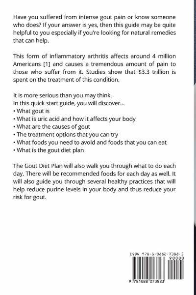 Have you suffered from intense gout pain or know someone who does? If your answer is yes, then this guide may be quite helpful to you especially if you're looking for natural remedies that can help. This form of inflammatory arthritis affects around 4 million Americans and causes a tremendous amount of pain to those who suffer from it. Studies show that $3.3 trillion is spent on the treatment of this condition. It is more serious than you may think. In this quick start guide, you will discover... ¿ What gout is ¿ What is uric acid and how it affects your body ¿ What are the causes of gout ¿ The treatment options that you can try ¿ What foods you need to avoid and foods that you can eat ¿ What is the gout diet plan Included in this guide are also curated recipes that will help you better manage your uric acid levels and prevent the occurrence of gout. The Gout Diet Plan will also walk you through what to do each day. There will be recommended foods for each day as well. It will also guide you through several healthy practices that will help reduce purine levels in your body and thus reduce your risk for gout. As additional bonuses, you will learn... ¿ Essential information about gout ¿ What foods you should avoid ¿ What foods you should eat ¿ A shopping list of recommended foods ¿ Recommended amounts of each acceptable food type ¿ A 4-week diet schedule with activities, food recommendations, and other safe practices to help reduce uric acid levels ¿ A 7-day meal plan ¿ Sample recipes that you can try Note that the 4-week meal plan also serves as a sample guide. You can use it to create a diet plan for the next few months. Remember that reducing uric acid levels takes more than just 1 month or 4 weeks.