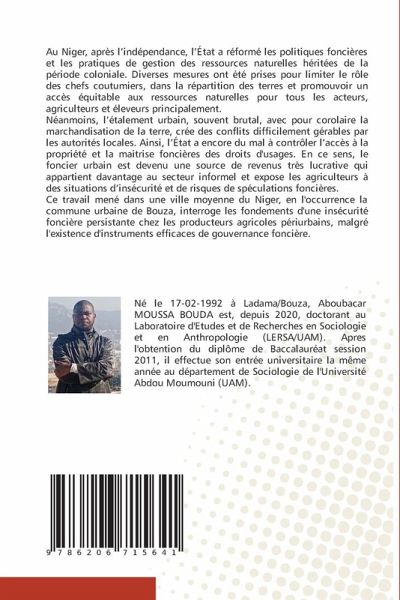 Au Niger, après l'indépendance, l'État a réformé les politiques foncières et les pratiques de gestion des ressources naturelles héritées de la période coloniale. Diverses mesures ont été prises pour limiter le rôle des chefs coutumiers, dans la répartition des terres et promouvoir un accès équitable aux ressources naturelles pour tous les acteurs, agriculteurs et éleveurs principalement.Néanmoins, l'étalement urbain, souvent brutal, avec pour corolaire la marchandisation de la terre, crée des conflits difficilement gérables par les autorités locales. Ainsi, l'État a encore du mal à contrôler l'accès à la propriété et la maitrise foncières des droits d'usages. En ce sens, le foncier urbain est devenu une source de revenus très lucrative qui appartient davantage au secteur informel et expose les agriculteurs à des situations d'insécurité et de risques de spéculations foncières.Ce travail mené dans une ville moyenne du Niger, en l'occurrence la commune urbaine de Bouza, interroge les fondements d'une insécurité foncière persistante chez les producteurs agricoles périurbains, malgré l'existence d'instruments efficaces de gouvernance foncière.