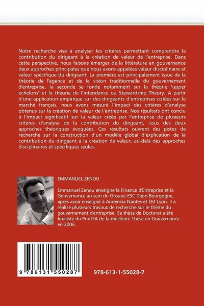 Notre recherche vise à analyser les critères permettant comprendre la contribution du dirigeant à la création de valeur de l'entreprise. Dans cette perspective, nous faisons émerger de la littérature en gouvernance deux approches principales que nous avons appelées valeur disciplinaire et valeur spécifique du dirigeant. La première est principalement issue de la théorie de l'agence et de la vision traditionnelle du gouvernement d'entreprise, la seconde se fonde notamment sur la théorie "upper echelons" et la théorie de l'intendance ou Stewardship Theory. A partir d'une application empirique sur des dirigeants d'entreprises cotées sur le marché français, nous avons mesuré l'impact des critères d'analyse obtenus sur la création de valeur de l'entreprise. Nos résultats ont conclu à l'impact significatif sur la valeur créée par l'entreprise de plusieurs critères d'analyse de la contribution du dirigeant, issus des deux approches théoriques évoquées. Ces résultats ouvrent des pistes de recherche sur la construction d'un modèle global d'explication de la contribution du dirigeant à la création de valeur, au-delà des approches disciplinaires et spécifiques seules.