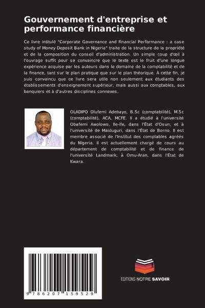 Ce livre intitulé "Corporate Governance and Financial Performance : a case study of Money Deposit Bank in Nigeria" traite de la structure de la propriété et de la composition du conseil d'administration. Un simple coup d'oeil à l'ouvrage suffit pour se convaincre que le texte est le fruit d'une longue expérience acquise par les auteurs dans le domaine de la comptabilité et de la finance, tant sur le plan pratique que sur le plan théorique. À cette fin, je suis convaincu que ce livre sera utile non seulement aux étudiants des établissements d'enseignement supérieur, mais aussi aux comptables, aux banquiers et à d'autres disciplines connexes.