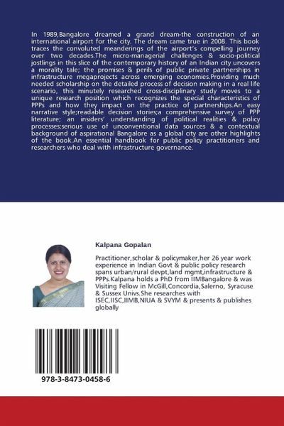 In 1989,Bangalore dreamed a grand dream-the construction of an international airport for the city. The dream came true in 2008. This book traces the convoluted meanderings of the airport's compelling journey over two decades.The micro-managerial challenges & socio-political jostlings in this slice of the contemporary history of an Indian city uncovers a morality tale; the promises & perils of public private partnerships in infrastructure megaprojects across emerging economies.Providing much needed scholarship on the detailed process of decision making in a real life scenario, this minutely researched cross-disciplinary study moves to a unique research position which recognizes the special characteristics of PPPs and how they impact on the practice of partnerships.An easy narrative style;readable decision stories;a comprehensive survey of PPP literature; an insiders' understanding of political realities & policy processes;serious use of unconventional data sources & a contextual background of aspirational Bangalore as a global city are other highlights of the book.An essential handbook for public policy practitioners and researchers who deal with infrastructure governance.