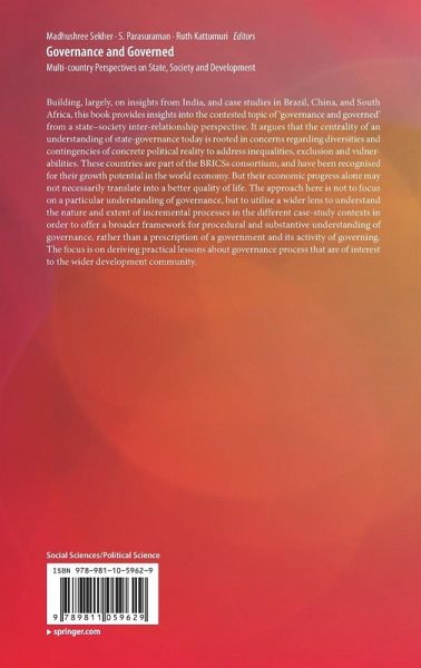 Building, largely, on insights from India, and case studies in Brazil, China, and South Africa, this book provides insights into the contested topic of 'governance and governed' from a state-society inter-relationship perspective. It argues that the centrality of an understanding of state-governance today is rooted in concerns regarding diversities and contingencies of concrete political reality to address inequalities, exclusion and vulnerabilities. These countries are part of the BRICSs consortium, and have been recognised for their growth potential in the world economy. But their economic progress alone may not necessarily translate into a better quality of life. The approach here is not to focus on a particular understanding of governance, but to utilise a wider lens to understand the nature and extent of incremental processes in the different case-study contexts in order to offer a broader framework for procedural and substantive understanding of governance, rather than a prescription of a government and its activity of governing. The focus is on deriving practical lessons about governance process that are of interest to the wider development community.