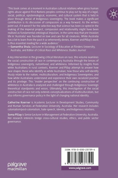 A key intervention in the growing critical literature on race, this volume examines the social construction of race in contemporary Australia through the lenses of Indigenous sovereignty, nationhood, and whiteness. Informed by insights from white Australians in rural contexts, Koerner and Pillay attempt to answer how race shapes those who identify as white Australian; how those who self-identify thusly relate to the nation, multiculturalism, and Indigenous Sovereignties; and how white Australians understand and experience their own racialized position and its privilege. This "insider perspective" on the continuing construction of whiteness in Australia is analyzed and challenged through Indigenous Sovereign theoretical standpoints and voices. Ultimately, this investigation of the social construction of race not only extends conceptualizations of multiculturalism, but also informs governance policy in the light of changing national identity.