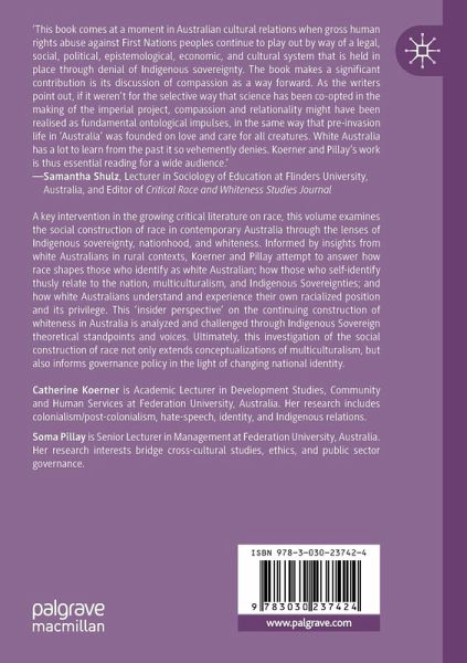 A key intervention in the growing critical literature on race, this volume examines the social construction of race in contemporary Australia through the lenses of Indigenous sovereignty, nationhood, and whiteness. Informed by insights from white Australians in rural contexts, Koerner and Pillay attempt to answer how race shapes those who identify as white Australian; how those who self-identify thusly relate to the nation, multiculturalism, and Indigenous Sovereignties; and how white Australians understand and experience their own racialized position and its privilege. This "insider perspective" on the continuing construction of whiteness in Australia is analyzed and challenged through Indigenous Sovereign theoretical standpoints and voices. Ultimately, this investigation of the social construction of race not only extends conceptualizations of multiculturalism, but also informs governance policy in the light of changing national identity.