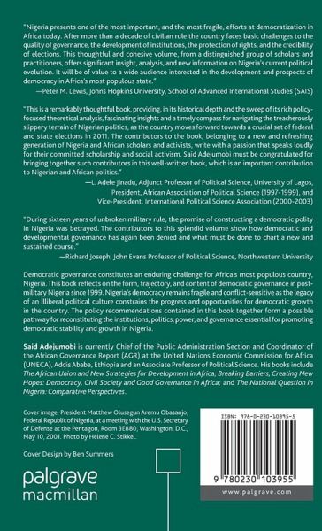 "This is a remarkably thoughtful book, providing, in its historical depth and the sweep of its rich policy-focused theoretical analysis, fascinating insights and a timely compass for navigating the treacherously slippery terrain of Nigerian politics, asthe country moves forward towards a crucial set of federal and state elections in 2011. The contributors to the book, belonging to a new and refreshing generation of Nigeria and African scholars and activists, write with a passion that speaks loud for their committed scholarship and social activism. Said Adejumobi must be congratulated for bringing together such contributors and the book, which is well-written, is an important contribution to Nigerian and African politics." - L. Adele Jinadu, AdjunctProfessor of Political Science and President, African Association of Political Science (1997-1999), and Vice-President, International Political Science Association (2000-2003)