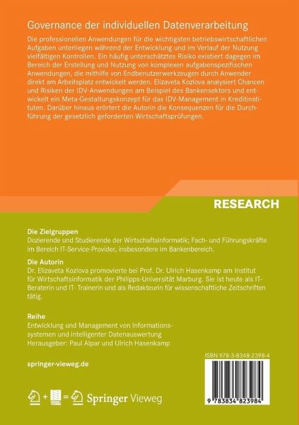 Die professionellen Anwendungen für die wichtigsten betriebswirtschaftlichen Aufgaben unterliegen während der Entwicklung und im Verlauf der Nutzung vielfältigen Kontrollen. Ein häufig unterschätztes Risiko existiert dagegen im Bereich der Erstellung und Nutzung von komplexen aufgabenspezifischen Anwendungen, die mithilfe von Endbenutzerwerkzeugen durch Anwender direkt am Arbeitsplatz entwickelt werden. Elizaveta Kozlova analysiert Chancen und Risiken der IDV-Anwendungen am Beispiel des Bankensektors und entwickelt ein Meta-Gestaltungskonzept für das IDV-Management in Kreditinstituten. Darüber hinaus erortert die Autorin die Konsequenzen für die Durchführung der gesetzlich geforderten Wirtschaftsprüfungen.