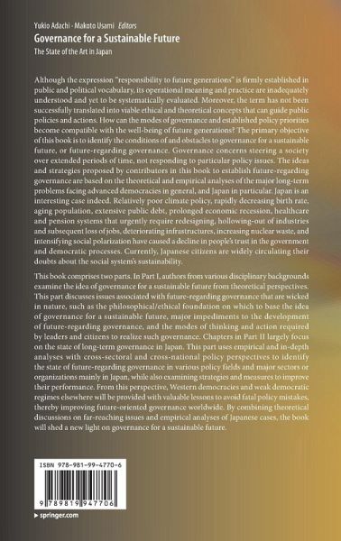 Preface.- Chapter 1 Introduction.- Part I Principles for Sustainability.- Chapter 2 Role of Legislators in Creating and Sustaining Governance for a Sustainable Future.- Chapter 3 Another Boundary Problem: Democracy, Future Generations, and the All-affected Principle.- Chapter 4 Another Reason for Caring about Future Generations.- Chapter 5 Responding to Existential Risks: Grounds, Targets, and Strategies.- Chapter 6 Trade-off between Repugnant and Sadistic Conclusions under the Separability of People's Lives.- Chapter 7 Dealing with "Wickedness" in Long-term Problem-solving.- Chapter 8 Governing Long-term Structural Changes in Socio-technological Systems and Their Difficulties: What do Sustainability Transition Studies Have to Address?.- Chapter 9 The Politics of Eco-nomics: A Critical Investigation of 'the Governance for a Sustainable Future' from the Perspective of Heterodox Economics.- Part II Strategies for Futurity.- Chapter 10 Tokyo's Linked CO2 Cap-and-Trade Program: A Blueprint for Cooperative Market-based Megacity Climate Policy?.- Chapter 11 Multidimensional Policy Analysis of the Energy System Transition in Japan: Case Studies of Local Energy Systems and Lessons to Improve Sustainability.- Chapter 12 Climate Change Adaptation for Futurity: Public-Private Partnerships in the Japanese Insurance Sector.- Chapter 13 Keeping Your Fossil-fuel Cake While Eating It? Comparing the Decarbonization Approach of BP, Chevron, ExxonMobil and Shell.- Chapter 14 Decarbonization and Critical Raw Materials.- Chapter 15 The Politics of Evidence in Japan: Struggling between Efficiency and Effectiveness and Beyond.- Chapter 16 Governance under Uncertainties for the COVID-19 Pandemic: Policy Lessons Learned in Japan from Resilience Perspectives.- Chapter 17 The Challenges for Health Systems and Policies: Growing Medicalization and Global Risks.