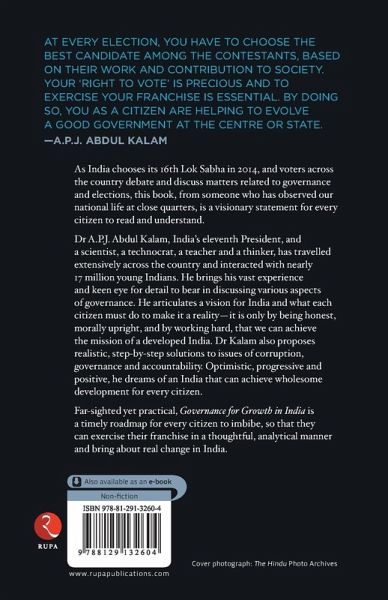 Indian elections for the 16th Lok Sabha saw many heated debates on various topics concerning governance. In such critical times, the 11th President of India, Dr A.P.J. Abdul Kalam urges the Indians to cast their vote for the right candidate. Through Governance For Growth In India, he expresses his vision for India and the contribution which each Indian citizen must make for the same.