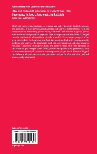 This book explores and analyzes governance and policy issues in South, Southeast, and East Asia. It maps governance challenges and analyzes current trends from the perspectives of democracy, public policy, and public institutions. Regional public administration and governance systems have undergone some phenomenal changes over the last three decades and have played a key role in the economic progress of the area, especially in the Southeast and East Asian nations. Rich with country-specific evidence and analyses, the chapters in the book apply empirical and other research methods to examine shifting paradigms and best practices. This book develops an understanding of changes in the forms, process and practices of governance, both within the context of each nation and in a comparative perspective. The book will appeal to scholars, academics, students, and practitioners of public administration, political science, and policy issues.