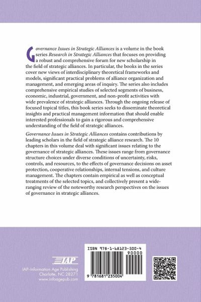 A volume in Research in Strategic Alliances Series Editor: T. K. Das, City University of New York Governance Issues in Strategic Alliances is a volume in the book series Research in Strategic Alliances that focuses on providing a robust and comprehensive forum for new scholarship in the field of strategic alliances. In particular, the books in the series cover new views of interdisciplinary theoretical frameworks and models, significant practical problems of alliance organization and management, and emerging areas of inquiry. The series also includes comprehensive empirical studies of selected segments of business, economic, industrial, government, and non-profit activities with wide prevalence of strategic alliances. Through the ongoing release of focused topical titles, this book series seeks to disseminate theoretical insights and practical management information that should enable interested professionals to gain a rigorous and comprehensive understanding of the field of strategic alliances. Governance Issues in Strategic Alliances contains contributions by leading scholars in the field of strategic alliance research. The 10 chapters in this volume deal with significant issues relating to the governance of strategic alliances. These issues range from governance structure choices under diverse conditions of uncertainty, risks, controls, and resources, to the effects of governance decisions on asset protection, cooperative relationships, internal tensions, and culture management. The chapters contain empirical as well as conceptual treatments of the selected topics, and collectively present a wide-ranging review of the noteworthy research perspectives on the issues of governance in strategic alliances.