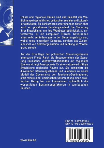 Auf der Grundlage der politischen Steuerungstheorie untersucht Frieda Raich die Besonderheiten der Steuerung räumlicher Wettbewerbseinheiten auf regionaler Ebene und zeigt Ansatzpunkte für eine wettbewerbsfähige Entwicklung regionaler Räume auf. Sie kombiniert die diskutierten Steuerungsebenen und -elemente zu einem Modell der Governance von Tourismus-Destinationen, stellt mittels einer empirischen Untersuchung einen praktischen Bezug her und konkretisiert schließlich die wesentlichen Bestimmungsfaktoren in touristischen Räumen.