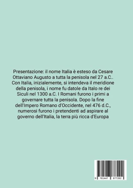 Governanti d'Italia dai Romani ai Savoia. Italia è il nome esteso da Cesare Ottaviano Augusto a tutta la penisola nel 27 a.C. Per Italia, inizialmente, si intendeva il meridione della penisola, nome datole da Italo re dei Siculi. I Romani furono i primi a governare tutta la penisola italiana. Sardegna e Sicilia per i Romani erano territori stranieri. Dopo la fine dell'Impero Romano nel 476 d.C. molti furono i pretendenti al governo dell'Italia. Non è stato facile raccogliere in 183 pagine la storia d'Italia dal 750 a.C. al 1946. Consoli, Imperatori, Re e Governanti vari hanno reso la storia italiana una delle più vaste al mondo.