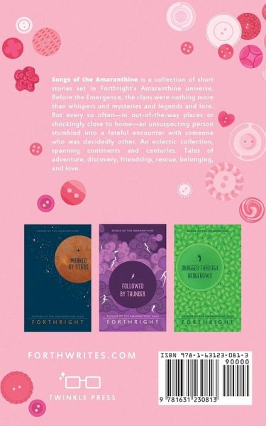 Four Songs of the Amaranthine stories in print: Marked by Stars Followed by Thunder Dragged through Hedgerows Governed by Whimsy Songs of the Amaranthine is a collection of short stories set in Forthright's Amaranthine universe. Before the Emergence, the clans were nothing more than whispers and mysteries and legends and lore. But every so often-in out-of-the-way places or shockingly close to home-an unsuspecting person stumbled into a fateful encounter with someone who was decidedly other. An eclectic collection, spanning continents and centuries. Tales of adventure, discovery, friendship, rescue, belonging, and love.