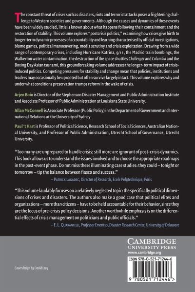 The constant threat of crises such as disasters, riots and terrorist attacks poses a frightening challenge to Western societies and governments. While the causes and dynamics of these events have been widely studied, we know little about what happens following their containment and the restoration of stability. This volume explores 'post-crisis politics,' examining how crises give birth to longer term dynamic processes of accountability and learning which are characterised by official investigations, blame games, political manoeuvring, media scrutiny and crisis exploitation. Drawing from a wide range of contemporary crises, including Hurricane Katrina, 9/11, the Madrid train bombings, the Walkerton water contamination, Space Shuttles Challenger and Columbia and the Boxing Day Asian tsunami, this is a ground-breaking volume which addresses the longer term impact of crisis-induced politics. Competing pressures for stability and change mean that policies, institutions and leaders may occasionally be uprooted, but often survive largely intact.
