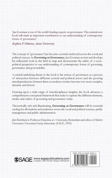 The concept of `governance' has become a central catchword across the social and political sciences. In Governing as Governance, Jan Kooiman revisits and develops his seminal work in the field to map and demonstrate the utility of a sociopolitical perspective to our understanding of contemporary forms of governing, governance and governability.