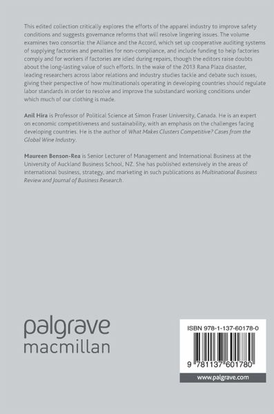 This edited collection critically explores the efforts of the apparel industry to improve safety conditions and suggests governance reforms that will resolve lingering issues. The volume examines two consortia: the Alliance and the Accord, which set up cooperative auditing systems of supplying factories and penalties for non-compliance, and include funding to help factories comply and for workers if factories are idled during repairs, though the editors raise doubts about the long-lasting value of such efforts. In the wake of the 2013 Rana Plaza disaster, leading researchers across labor relations and industry studies tackle and debate such issues, giving their perspective of how multinationals operating in developing countries should regulate labor standards in order to resolve and improve the substandard working conditions under which much of our clothing is made.