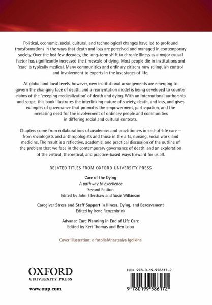 Political, economic, social, cultural and technological changes have led to profound transformations in the ways that death and loss are perceived and managed in contemporary society. Over the last few decades, the long term shift to chronic illness as a major causal factor has significantly increased the time scale of dying. Most people die in institutions and 'care' is typically medical. Many communities and ordinary citizens now relinquish control and involvement to experts in the last stages of life. At global and local levels, however, new arrangements are emerging to govern the changing face of death, and a reorientation model is being developed to counter claims of the 'creeping medicalisation' of death and dying. With an international authorship and scope, this book illustrates the interlinking nature of society, death and loss, and it gives examples of governance that promotes the empowerment, participation and the increasing need for the involvement of ordinary people and communities in differing social and cultural contexts. Chapters come from collaborations of academics and practitioners in end of life care - from sociologists, anthropologists or the arts but also from nursing, social work, or medicine. The result is a reflective, academic and practical discussion of the outline of the problem we face in the contemporary governance of death, and an exploration of the critical, theoretical and practice-based ways forward for us all. Features * All chapters are written at an accessible level and will appeal to a wide readership * Part 1 of the book provides a sociological understanding of the governance of death and loss in international and historical contexts, and the implications for practice * Part 2 provides examples of good practice, drawing upon a sociological understanding