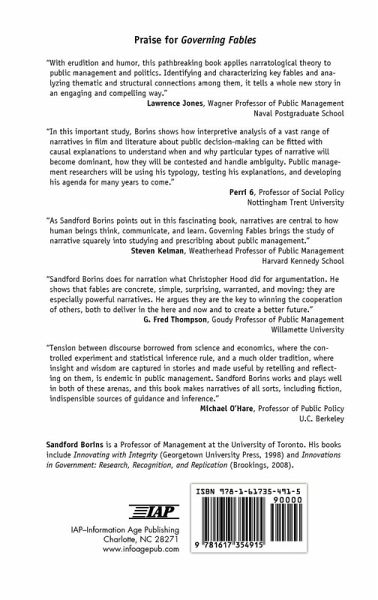 A volume in Research in Public Management Series Editor: Lawrence R. Jones, Naval Postgraduate School Governing Fables: Learning from Public Sector Narratives advocates the importance of narrative for public servants, exemplifies it with a rigorously selected and analyzed set of narratives, and imparts narrative skills politicians and public servants need in their careers. Governing Fables turns to narratology, the interdisciplinary study of narrative, for a conceptual framework that is applied to a set of narratives engaging life within public organizations, focusing on works produced during the last twenty-five years in the US and UK. The genres discussed include British government narratives inspired by and reacting to Yes Minister, British appeasement narratives, American political narratives, the Cuban Missile Crisis narrative, jury decision-making narratives, and heroic teacher narratives. In each genre lessons are presented regarding both effective management and essential narrative skills. Governing Fables is intended for public management and political science scholars and practitioners interested in leadership and management, as well as readers drawn to the political subject matter and to the genre of political films, novels, and television series.