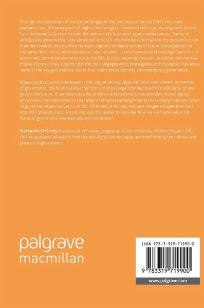 The 21st century has born witness to myriad changes in the way the world is secured from the many emergencies that continually threaten to disrupt it. This book concentrates on two such changes. First, it takes stock of the ever-increasing development and diversification of data and digital technologies that security organisations have at their disposal. Secondly, it examines how these digital devices have fostered a new direction in which security agencies primarily conceive of emergencies as so many risks of the future. Emergency governance has undergone what might be called an anticipatory turn here, with digitally rendered and imagined scenes of future contingency becoming cause and justification for intervention in the here and now. Rather than scrutinising this turn at its most spectacular heights in the domains, for instance, of warfare or counter-terrorism, the book explores the facilitation of risk governance through digital technologies in a more quotidian incarnation; namely by tracing the steps that the United Kingdom's Fire and Rescue Service (FRS) take to govern fire emergencies whose potential has been identified but have yet to unfold. Delving into the FRS, the book maps out a digital infrastructure that includes various software, institutional processes, multiple forms of risk calculation but also human beings, relations and consciousness and an array of material spaces in which these things exist. Accentuated here is how these components assemble to produce projections of future emergencies on a number of sensorial registers. This infrastructure is shown, in turn, to inform and shape a catalogue of refined modes of action through which interventions on future emergencies are made in the present. Engaging in depth with this infrastructure, the FRS provides an understanding of risk as a lived relation, risk as an organisational ethos whose liveliness is founded upon and reverberates through the relations existing between those people and things operating in the FRS to make sense of potential fire emergencies. Using the concept of lived relation as a foundation, the book develops a critical understanding of anticipatory governance by grasping its resonance with issues emanating in the wider field of security, showing how security figures as a set of practices that rely upon and cultivates affective conditions, that enrols the force of elements like fire into its institutional arrangement, that draw on an array of knowledges to exercise power and, in the process, that instantiate new forms of subjectivity.