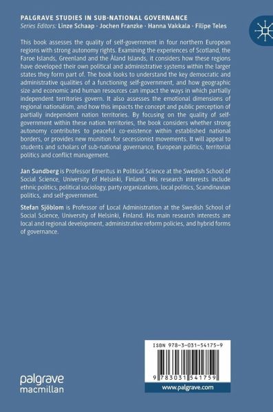 Chapter 1.- Introducing Partially Independent Nation Territories.- Chapter 2.- Credibility Explanations for the Success of Ethnoautonomy Arrangements. Chapter 3 -The Quality of Large and Small Nation Territory Governments.- Chapter 4.- Good Governance' and Entrenched Self-Government in Scotland: A Success?.- Chapter 5 -The Capacity of Self-Government in Greenland.- Chapter 6.- Faroese Self-Government: A Disputed but Evolved Model.- Chapter 7.- The quality of Self-government in the Åland Islands.- Chapter 8.- Is it better for nation territories to stand on one or two feet?