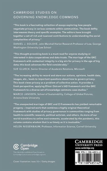 Introduction; 1. Personal information as a knowledge commons resources Madelyn Rose Sanfilippo, Brett Frischmann and Katherine J. Strandburg; 2. How private individuals maintain privacy and govern their own health data cooperative: MIDATA in Switzerland Felix Gille and Effy Vayena; 3. Pooling mental health data with Chatbots Michael Mattioli; 4. Privacy in practice: a socio-technical integration research (STIR) study of rules-in-use within institutional research Kyle M. L. Jones and Chase McCoy; 5. Public Facebook groups for political activism Madelyn Rose Sanfilippo and Katherine J. Strandburg; 6. The republic of letters and the origins of scientific knowledge commons Michael J. Madison; 7. Privacy and knowledge production across contexts Brett Frischmann, Katherine Haenschen and Ari Ezra Waldman; 8. Governing the internet of everything Scott J. Shackelford; 9. Contextual integrity as a gauge for governing knowledge commons Yan Shvartzshnaider, Madelyn Rose Sanfilippo and Noah Apthorpe; 10. Designing for the privacy commons Darakhshan J. Mir; Conclusion.