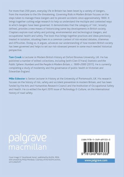 For more than 200 years, everyday life in Britain has been beset by a variety of dangers, from the mundane to the life-threatening. Governing Risks in Modern Britain focuses on the steps taken to manage these dangers and to prevent accidents since approximately 1800. It brings together cutting-edge research to help us understand the multiple and contested ways in which dangers have been governed. It demonstrates that the category of 'risk', broadly defined, provides a new means of historicising some key developments in British society. Chapters explore road safety and policing, environmental and technological dangers, and occupational health and safety. The book thus brings together practices and ideas previously treated in isolation, situating them in a common context of risk-related debates, dilemmas and difficulties. Doing so, it argues, advances our understanding of how modern British society has been governed and helps to set our risk-obsessed present in some much neededhistorical perspective.