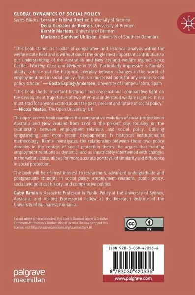 This open access book examines the comparative evolution of social protection in Australia and New Zealand from 1890 to the present day, focusing on the relationship between employment relations and social policy. Utilising longstanding and more recent developments in historical institutionalist methodology, Ramia investigates the relationship between these two policy domains in the context of social protection theory. He argues that treating employment relations as dynamic, and as inextricably intertwined with changes in the welfare state over time, allows for more accurate portrayal of similarity and difference in social protection.