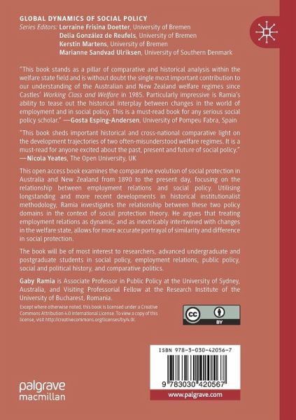 This open access book examines the comparative evolution of social protection in Australia and New Zealand from 1890 to the present day, focusing on the relationship between employment relations and social policy. Utilising longstanding and more recent developments in historical institutionalist methodology, Ramia investigates the relationship between these two policy domains in the context of social protection theory. He argues that treating employment relations as dynamic, and as inextricably intertwined with changes in the welfare state over time, allows for more accurate portrayal of similarity and difference in social protection.