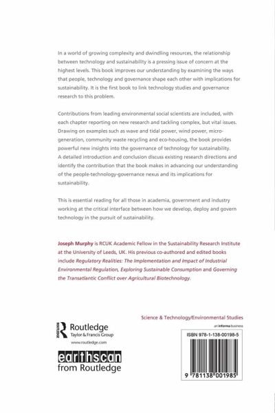 In a world of growing complexity and dwindling resources, the relationship between technology and sustainability is a pressing issue of concern at the highest levels. This book improves our understanding by examining the ways that people, technology and governance shape each other with implications for sustainability. It is the first book to link technology studies and governance research to this problem. Contributions from leading environmental social scientists are included, with each chapter reporting on new research and tackling complex, but vital issues. Drawing on examples such as wave and tidal power, wind power, micro-generation, community waste recycling and eco-housing, the book provides powerful new insights into the governance of technology for sustainability. A detailed introduction and conclusion discuss existing research directions and identify the contribution that the book makes in advancing our understanding of the people-technology-governance nexus and its implications for sustainability. This is essential reading for all those in academia, government and industry working at the critical interface between how we develop, deploy and govern technology in the pursuit of sustainability.