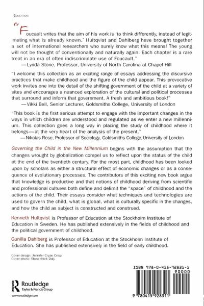Preface Chapter 1. Governing the child in the new millennium Kenneth Hultqvist and Gunilla Dahlberg Chapter 2. Safety and danger: Childhood, Sexuality, and Space at the end of the millennium Valerie Walkerdine Chapter 3. Time Matters in Adolescence Nancy Lesko Chapter 4. The Pacing and Timing of Children's Bodies Chris Jenks Chapter 5. Administering Freedom. A History of the Present-Rescuing Parents to Rescue the Child for Society Tom S. Popkewitz and Marianne Bloch Chapter 6. Educating Flexible Souls: The construction of Subjectivity through Developmentality and Interactionism Lynn Fendler Chapter 7. Bringing the Gods and the Angels Back? A modern pedagogical saga about excess in moderation Kenneth Hultqvist Chapter 8. Childhood, School and Family. Continuity and displacement in recent researchers Mirian Warde Chapter 9. Childhood and the Politics of Memory in Argentina Ines Dussel Chapter 10. Construction of the Child in Mexican Legislative Discourse Rosa Nidia Buenfil Chapter 11. When post-structuralism meets Gender Julie McLeod