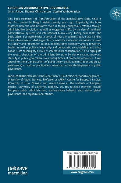 This book examines the transformation of the administrative state, since it was first coined by Dwight Waldo seventy years ago. Empirically, the book assesses how the administrative state is facing endogenous reforms through administrative devolution, as well as exogenous shifts by the rise of multilevel administrative systems and international bureaucracy. Facing dual shifts, the book offers a comprehensive analysis of how the administrative state handles three interconnected challenges: first, a need for innovation and reform, as well as stability and robustness; second, administrative autonomy among regulatory bodies, as well as political leadership and democratic accountability; and third, nation-state sovereignty and international collaboration. It also highlights the robust character of the administrative state by demonstrating profound stability in public governance even during times of profound turbulence. It will appeal to scholars and students of public policy, public administration and global governance, as well as practitioners interested in new developments in public governance.