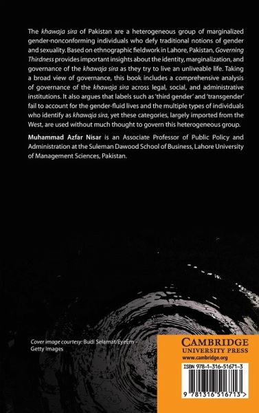 1. Governance, thirdness and the Khawaja Sira of Pakistan 2. Governing thirdness through religion, history and language Section I. Social Governance: 3. Governing thirdness in the family 4. Governance in the Khawaja Sira community Section II. Legal Governance: 5. Governing thirdness by law 6. Resisting legal thirdness Section III. Bureaucratic Governance: 7. Governing thirdness at the bureaucratic offices 8. Governing thirdness at work 9. Governing thirdness on the street 10. Resisting bureaucratic governance of thirdness 11. Waste, governance and inclusion Bibliography Index.
