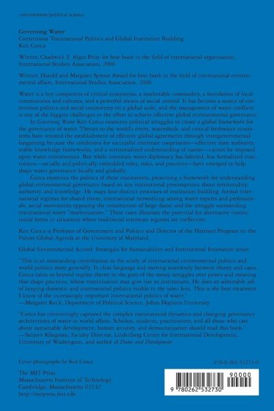 Water is a key component of critical ecosystems, a marketable commodity, a foundation of local communities and cultures, and a powerful means of social control. It has become a source of contentious politics and social controversy on a global scale, and the management of water conflicts is one of the biggest challenges in the effort to achieve effective global environmental governance. In Governing Water, Ken Conca examines political struggles to create a global framework for the governance of water. Threats to the world's rivers, watersheds, and critical freshwater ecosystems have resisted the establishment of effective global agreements through intergovernmental bargaining because the conditions for successful interstate cooperation—effective state authority, stable knowledge frameworks, and a territorialized understanding of nature—cannot be imposed upon water controversies. But while interstate water diplomacy has faltered, less formalized institutions—socially and politically embedded rules, roles, and practices—have emerged to help shape water governance locally and globally. Conca examines the politics of these institutions, presenting a framework for understanding global environmental governance based on key institutional presumptions about territoriality, authority, and knowledge. He maps four distinct processes of institution building: formal international regimes for shared rivers; international networking among water experts and professionals; social movements opposing the construction of large dams; and the struggle surrounding transnational water "marketization." These cases illustrate the potential for alternative institutional forms in situations where traditional interstate regimes are ineffective.