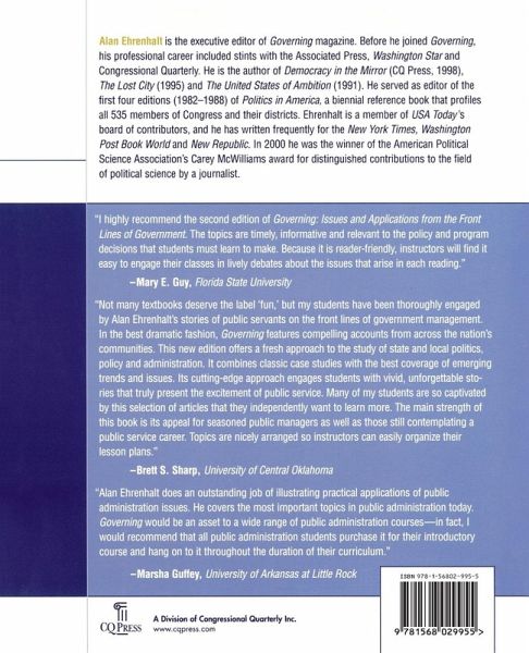 Distinguished author and editor Alan Ehrenhalt has chosen 40 articles that represent the best of what Governing has to offer: objective reporting about the issues that matter most, engaging writing by first-class journalists, and the ability to tell a good story while imparting important lessons about governance. With a focus on current controversies, hot policy debates, and recent political machinations, each reading comes from an issue published in the last two years. An ideal collection of applied case studies for public administration and management courses, this handy reader is especially useful for those instructors looking for more state and local coverage to supplement core texts.This second edition continues to focus on key management functions such as personnel, performance, and leadership, as well as on the impact of changes in federalism, technology, and regulation. This edition also includes more policy coverage on crime, health, and education as well as other pressing concerns like homeland security and ethics in government.