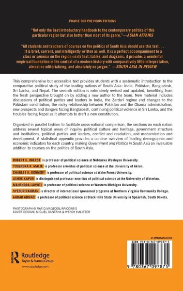 List of Tables and Illustrations Preface to the Seventh Edition 1 Introduction I INDIA 2 Political Culture and Heritage: A Changing Political Culture 3 State Institutions and Changing Political Dynamics 4 Shifting Perspectives About Political Parties and Political Leaders 5 Groups and Multiple Demands on the System 6 Conflict Management 7 Modernization and Development with Indian Characteristics II PAKISTAN 8 Political Culture and Heritage 9 Constitutional Structure 10 Political Parties and Political Leaders 11 Conflict and Mediation 12 Policy Issues 13 Problems and Prospects III BANGLADESH 14 Political Culture and Heritage 15 Government Institutions 16 Elections, Parties, and Interest Groups 17 Conflicts and Resolution 18 Modernization and Development: Prospects and Problems IV SRILANKA 19 Political Culture and Heritage 20 Government Structure 21 Political Parties and Interest Groups 22 Conflict Mediation: Ethnic and Political Conflict 23 The Search for Prosperity 24 Modernization and Development: Prospects and Problems V NEPAL 25 Political Heritage and Culture 26 Political Institutions and Governmental Processes 27 Political Parties, Elections, and Leaders 28 Class and Identity Conflicts 29 Modernization and Development: Problems and Prospects VI SOUTH ASIA 30 The Future: South Asia as a Region and a Player in the World System Statistical Appendix Index
