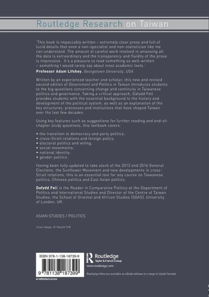 Written by an experienced teacher and scholar, this new and revised second edition of Government and Politics in Taiwan introduces students to the big questions concerning change and continuity in Taiwanese politics and governance. Taking a critical approach, Dafydd Fell provides students with the essential background to the history and development of the political system, as well as an explanation of the key structures, processes and institutions that have shaped Taiwan over the last few decades.