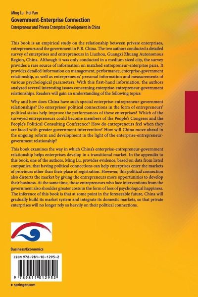 This book is an empirical study on the relationship between private enterprises, entrepreneurs and the government in P. R. China. The two authors conducted a detailed survey of enterprises and entrepreneurs in Liuzhou, Guangxi Zhuang Autonomous Region, China. Although it was only conducted in a medium sized city, the survey provides a rare source of information on matched entrepreneur-enterprise pairs. It provides detailed information on management, performance, enterprise-government relationship, as well as entrepreneurs' personal information and measurements of various psychological parameters. With this first-hand information, the authors analyzed several interesting issues concerning enterprise-entrepreneur-government relationships. Readers will gain an understanding of the following topics: