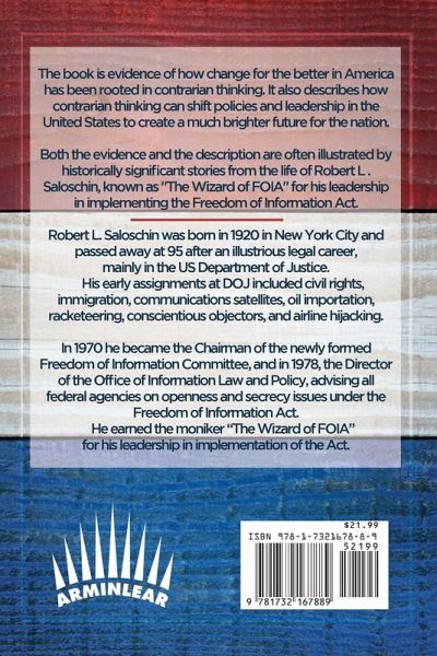 Release of the eBook and paperback versions commemorate the 100th anniversary of Robert L. Saloschin's birth and bring enduring, yet fresh, ideas to discussions of public policy.The book is evidence of how change for the better in America has been rooted in contrarian thinking. It also describes how contrarian thinking can shift policies and leadership in the United States to create a much brighter future for the nation.Both the evidence and the description are often illustrated by historically significant stories from the life of Bob Saloschin, known as "The Wizard of FOIA" for his leadership in implementing the Freedom of Information Act.Robert L. Saloschin had an illustrious career in the United States Department of Justice and, after his retirement, served as a community leader in suburban Washington, DC.