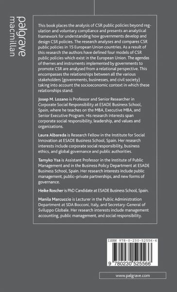 This book presents an analytical framework for understanding how governments develop policies of corporate social responsibility (CSR). The research analyses CSR public policies in 15 European Union countries, and it defines four models of governmental approach from a relational perspective.